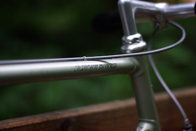 Recently I came accross this light green metallic Gazelle Champion Mondial AB-Frame dating back to may be 1979. It came with a Stronglight A9 Aluminium headset and Campagnolo Super Record Bottom Bracket. Obviously this frame was asking for a Campagnolo setup.